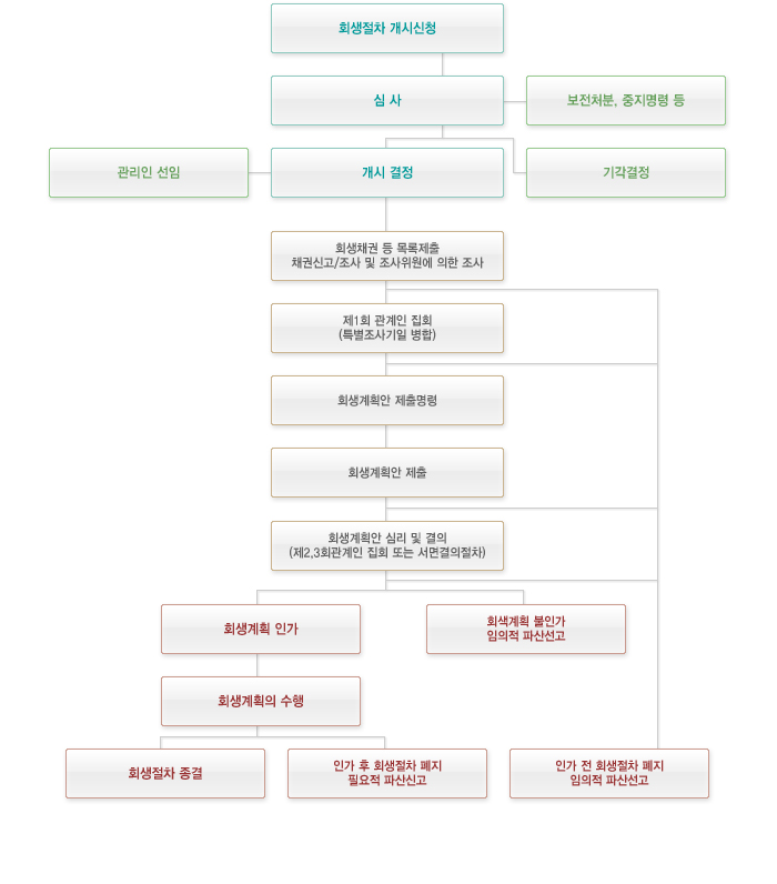 반면 회생 신청을 통해 법원은 채무자의 재산에 대한 개별 강제집행절차의 중지명령 등을 하거나, 모든 회생채권자 및 회생담보권자에 대하여 장래의 강제집행 등을 금지하는 포괄적 금지명령을 할 수 있으며, 이는 신청 기업이 정상적인 경영을 할 수 있는 환경을 만들어 주고자 함입니다.