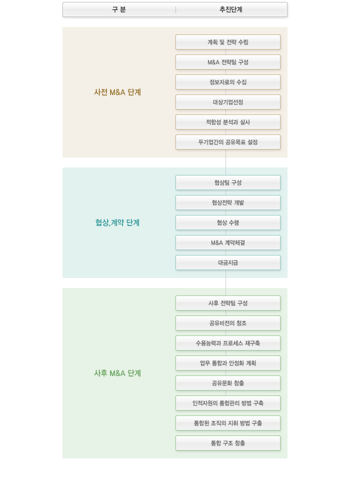 팀은 크게 사전 M&A팀, 협상팀, 사후 M&A팀으로 나누어지고 다시 세부단계와 전략에 따라 구성된다.