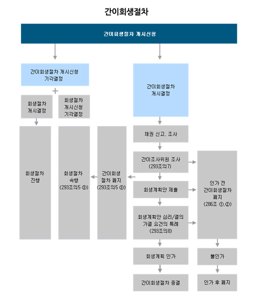 - 간이회생절차는 신청 당시를 기준으로 회생채권 및 회생담보권(신청인의 총부채)의 총액이 50억원 이하인 법인 또는 개인사업자만을 대상으로 하는 간소화된 회생절차입니다.